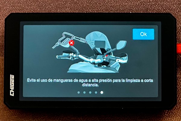 Después nos aparecerán cinco pantallas informativas, que podremos ir pasando, con algunos consejos como que necesitaremos una tarjeta de memoria rápida para actualizar el GPS, como instalar las cámaras opcionales si las hemos adquirido y, por último, dos consejos de seguridad: uno sobre el peligro de usar el navegador en marcha y el otro con la advertencia de que no lavemos el aparato con agua a presión.