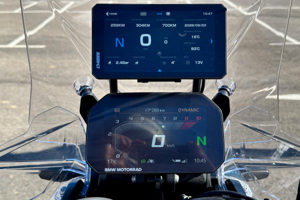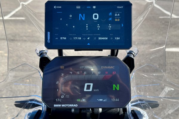 Además, disponemos de varias pantallas como la del ordenador de a bordo, la cual se comunica con la centralita de la moto y nos da toda la información que necesitamos, incluida la presión de los neumáticos, la altitud y hasta el tiempo si tenemos instalada la SIM de datos en el GPS.