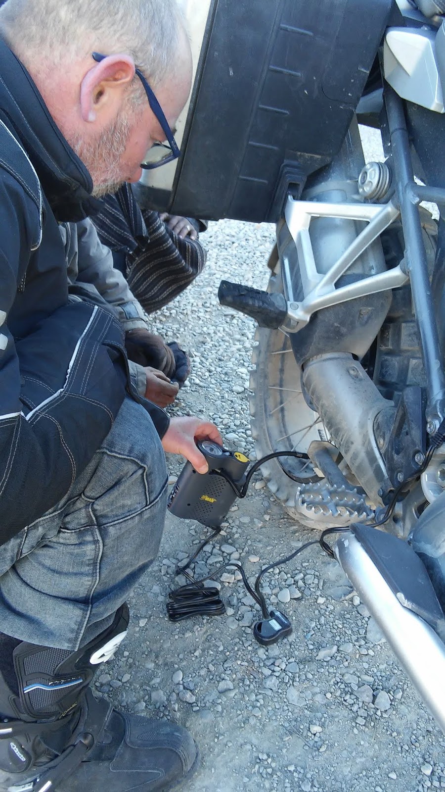 Esta vez sí, por lo que la noche anterior ya dejé la moto lista y preparada para rodar fuera del asfalto. Algo pasó al bajar presiones, seguramente se enganchó el obús de la válvula y la rueda estaba completamente deshinchada en la fría mañana.