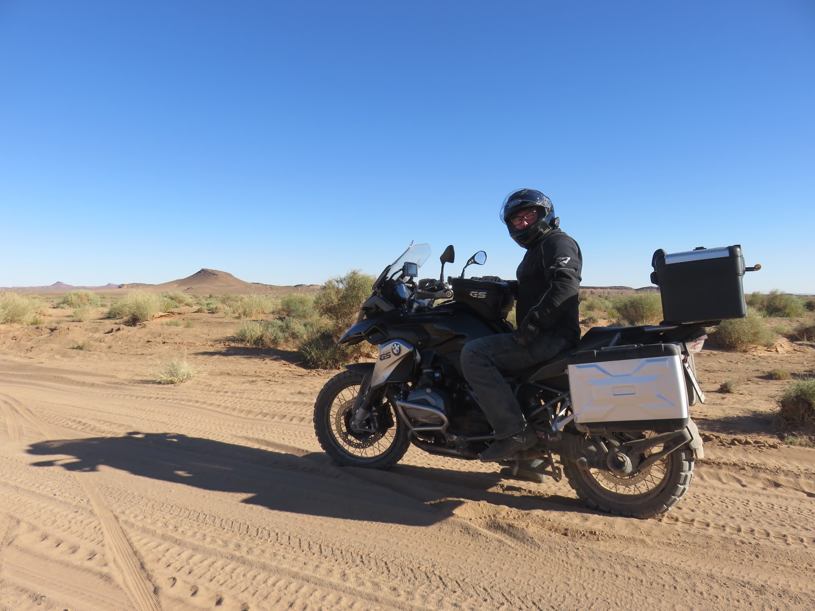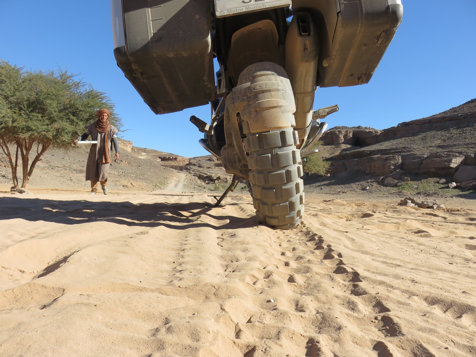 A medida que avanzamos el camino va cediendo paso cada vez más a la arena. La moto zigzaguea con escaso control. Un susto...gasss, otro susto....más gasss, que nos caemos, que sí ..que no...gassss. Acabamos de librar una que parecía imposible... Debemos rondar los cuatrocientos kilos en orden de marcha y esto cansa, aún así ella sigue sacando fotos y dándome coraje mientras se cachondea. Finalmente como no podía ser de otra forma hay una que no salvamos y nos vamos al suelo sin más consecuencias que un bollo de recuerdo en una maleta.